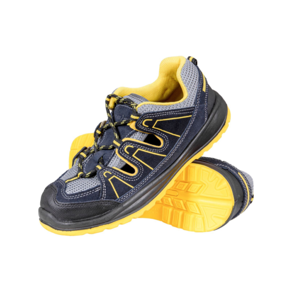 Przewiewne bezpieczne sandały robocze z otworami wentylacyjnymi, wykonane ze skóry zamszowej w połączeniu z siateczką zwiększającą cyrkulacje powietrza wewnątrz buta.