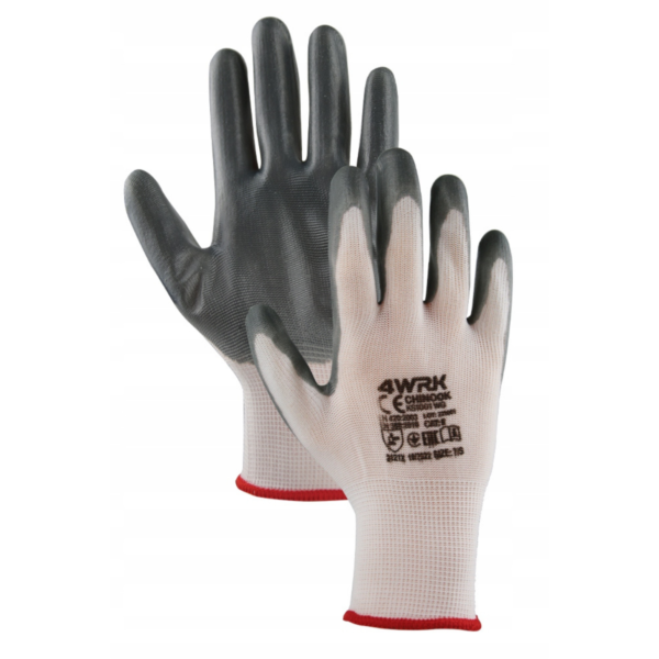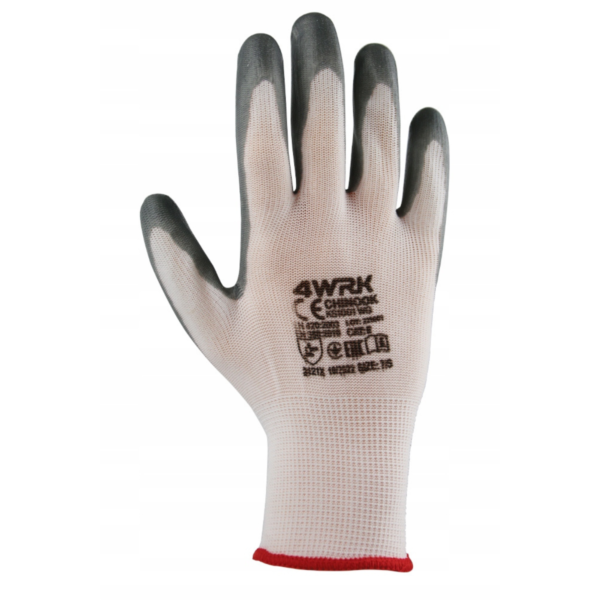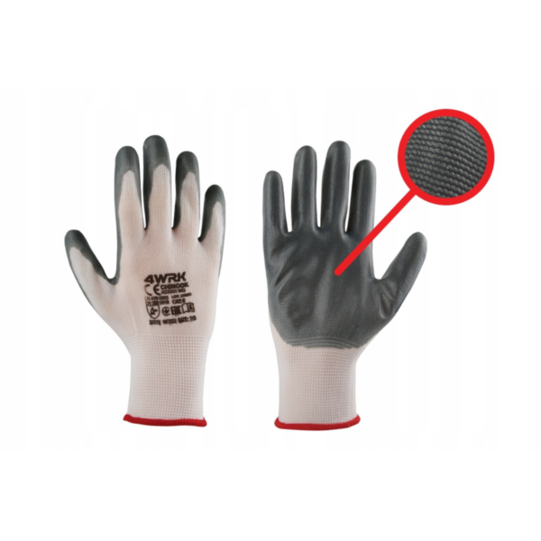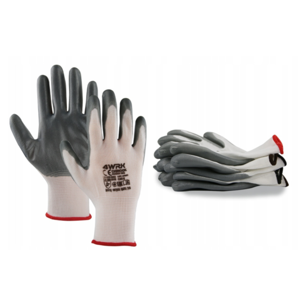 - Rękawice poliestrowe w kolorze białym, powlekane cienką warstwą szarego nitrylu.