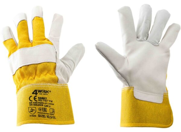 Wzmocnione skórą kozią, oferują doskonałą odporność na rozdarcia, a ich mocne szycie gwarantuje długotrwałą żywotność. Połączenie skóry z trwałym żółtym materiałem wpływa na bezpieczeństwo podczas wykonywania pracy.